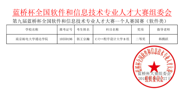 本次比赛由来自全国高校的省赛一等奖获奖者展开激烈角逐。在太阳官网韩腾跃老师的指导下,来自2015级计算机科学与技术专业的郭王宗瀚顺利在省赛中晋级,并在全国总决赛中发挥出色,荣获二等奖,为太阳官网赢得了荣誉。