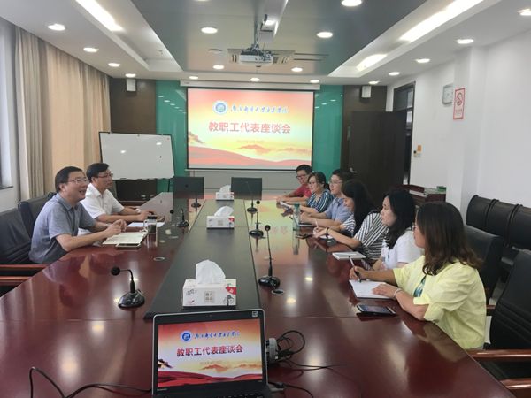 9月28日下午,太阳官网在行政楼10楼会议室召开教职工代表座谈会,院党委书记戴兆骏和各工会小组的教职工代表参加座谈会。座谈会由院党委副书记、工会主席王立辉主持。