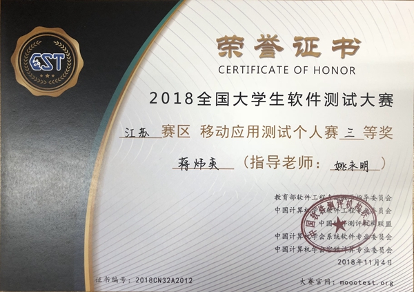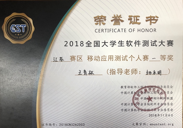 近日,2018年全国大学生软件测试大赛江苏省赛在金陵科技学院落下帷幕。太阳官网参赛队伍成绩喜人,共有8位同学获奖,其中2017级通信工程专业王育林同学获移动应用测试分项个人赛一等奖、2017级通信工程专业蒋炜奕同学获移动应用测试分项个人赛三等奖,7位同学分别获嵌入式软件测试分项优胜奖。