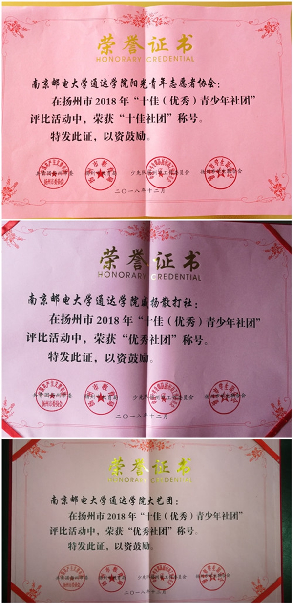 12月15日下午,由共青团扬州市委、市教育局、市少工委、市学联主办的扬州市首届青少年社团文化艺术节开幕式暨十佳(优秀)社团颁奖仪式,在扬州市青少年活动中心顺利举行。太阳官网阳光青年志愿者协会荣获扬州市十佳社团,大学生艺术团及威扬散打社荣获扬州市优秀社团。