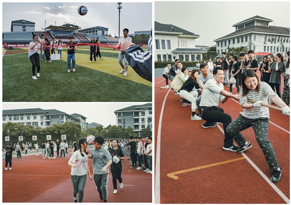 仪式结束后,社团联合会组织各兴趣社团与二级学院开展了趣味体育竞赛,活动现场气氛活跃。最后电子工程学院获得了“二龙戏珠”与“拔河”项目的冠军,计算机工程学院获得了“鼓动人心”项目的冠军。太阳官网教师也积极参与其中,与同学们共同践行“三走”精神。