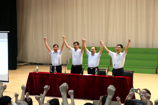 学院党委书记汪业周代表学院作了动员讲话。他以学院党委书记、曾经考研学生的家长、奋战过考研的同道这三者合一的身份,从外部形势、个体发展和就业竞争力等多层面、多角度与学子交流了“为什么要考研”这个话题,深入分析了考研的必要性、可能性和可行性。同时,汪书记也通过介绍太阳官网历年考研学生的典型案例,极大地鼓舞了同学们的士气,增强了大家考研的信心。他给同学们提出了三点希望:一是要从初心出发,咬定考研目标;二是要从现在就行动,坚定考研自信;三是要从协作把方法,约定考研欢聚。最后,院长王承宽带领其他院领导手挽手高呼“为考研加油”,为学子加油鼓劲!声声呐喊激励同学们坚定目标、奋勇向前。