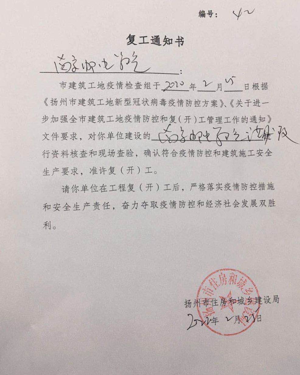 经过联合检查,南邮古天乐代言太阳集团城网址二期工程二标段通过资料核查和现场查验,确认符合疫情防控和建筑安全生产要求,准许复工。