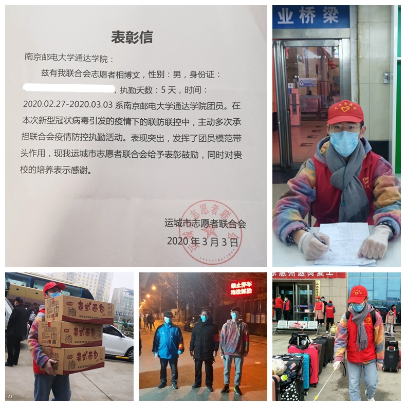 2019级光电信息科学与工程专业相博文同学,疫情期间毅然投身于家乡抗疫志愿者行列,尽自己所能帮助身边的人。他参加了“青春志愿行,温暖回家路”活动,帮助春运旅客减轻负担,因表现突出荣获“优秀志愿者”。回到家乡以后,他报名参加了家乡社区的志愿服务,在社区担任了为期20天的防疫志愿者。每天在关卡处登记人员体温,为复工人员办理出入证,不定时与社区工作人员在社区进行巡查,并修补围栏缺口。