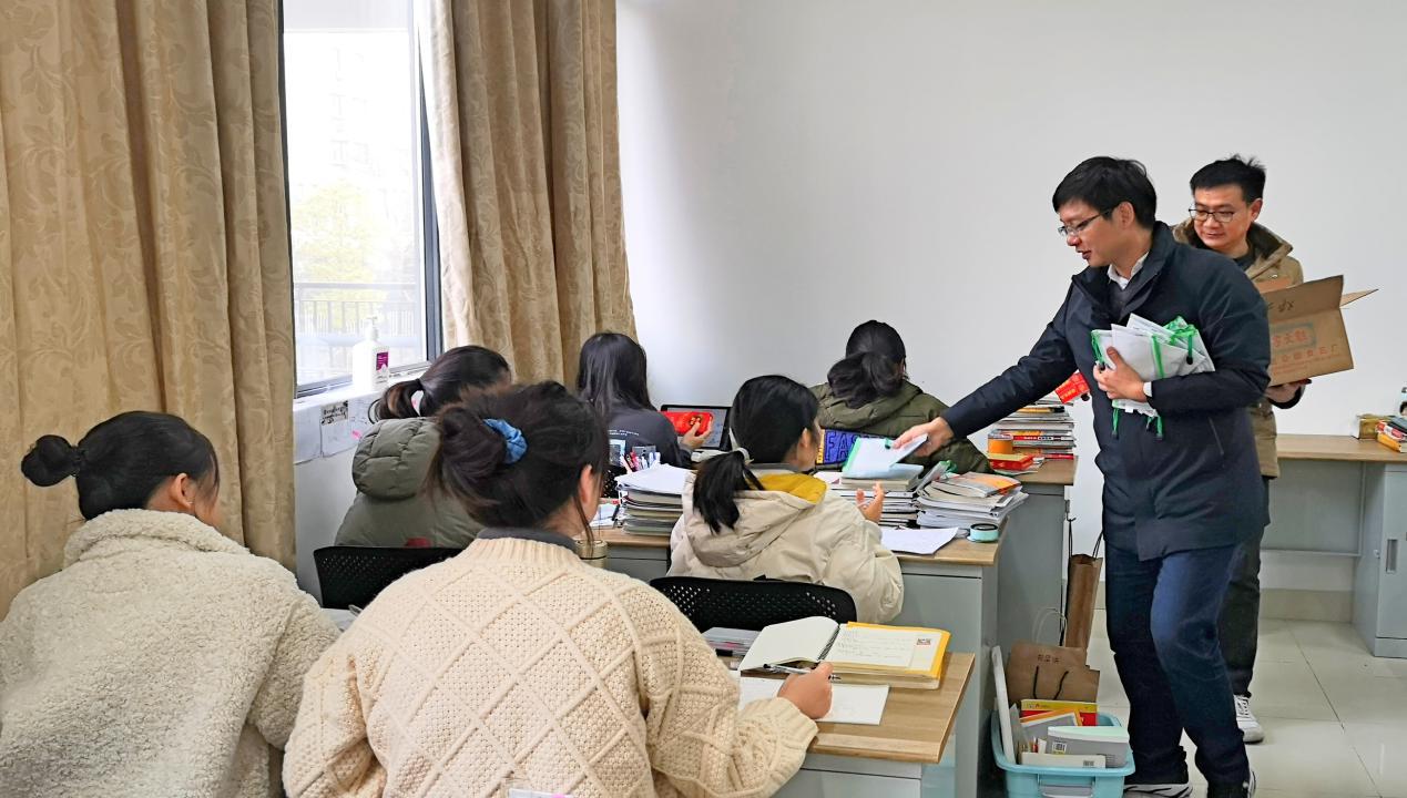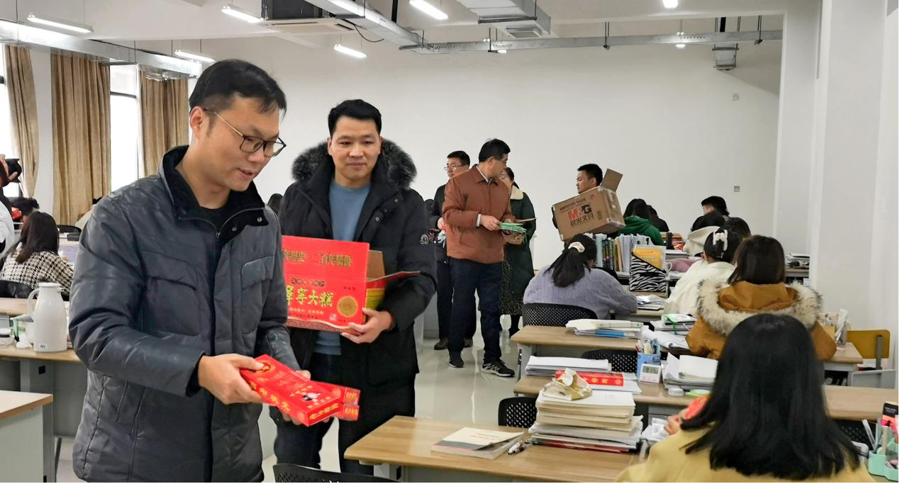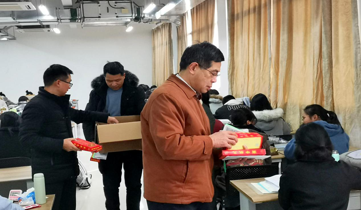 在考研教室,王承宽院长现场给考研学子加油鼓劲,预祝大家考取理想的学校,并亲切叮嘱考研学子们:一是要充分利用最后的20多天时间加强学习;二是寒冬腊月,气温骤降,务必要保重身体。其他院领导现场也都给考研同学鼓劲加油,送上祝愿。随后,领导们为考研学子送上了学院精心准备的考研文具袋以及状元糕,送上学院的温暖和祝福。
