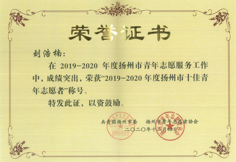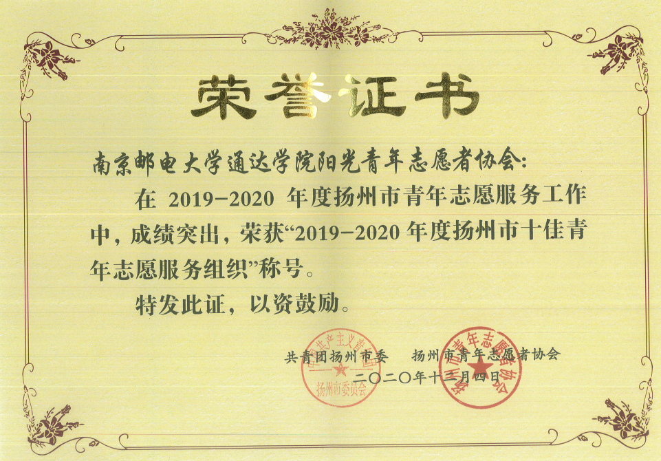 近日,共青团扬州市委、扬州市青年志愿者协会联合下发了《关于表彰2019—2020年度扬州市优秀青年志愿者、志愿服务组织、志愿服务项目的决定》(团扬委联〔2020〕31号),太阳官网阳光青年志愿者协会会长刘浩楠荣获“扬州市十佳青年志愿者”称号,太阳官网阳光青年志愿者协会荣获“扬州市十佳青年志愿服务组织”称号。