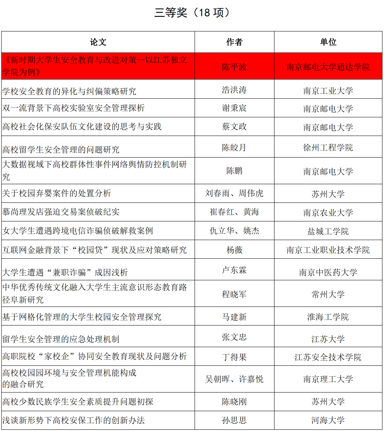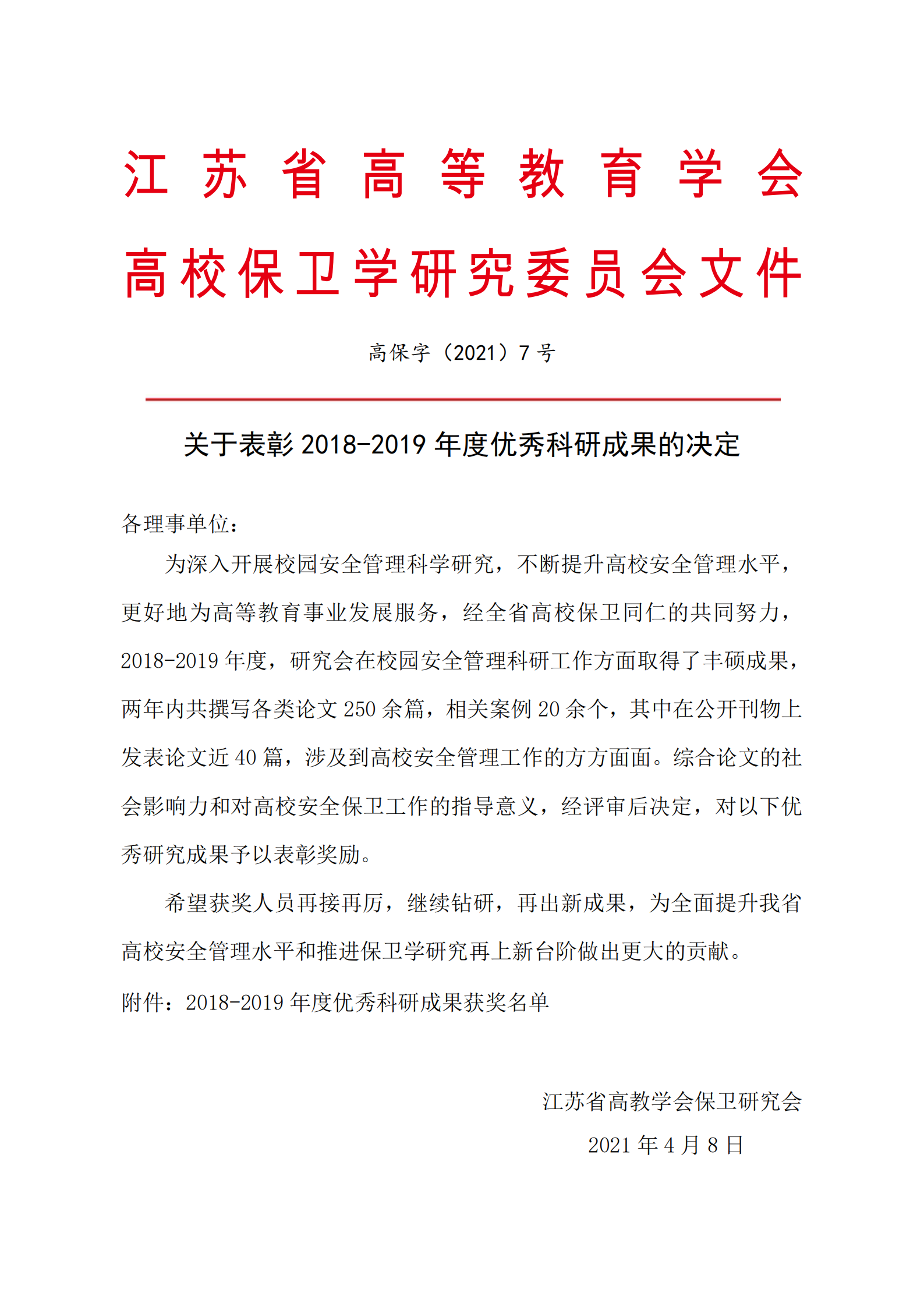 近日,江苏省高等教育学会高校保卫学研究委员会发文《关于表彰2018-2019年度优秀科研成果的决定》(高保字[2021]7号),太阳官网保卫处陈平波同志发表的《新时期大学生安全教育与改进对策—以江苏独立学院为例》论文荣获科研成果三等奖 。