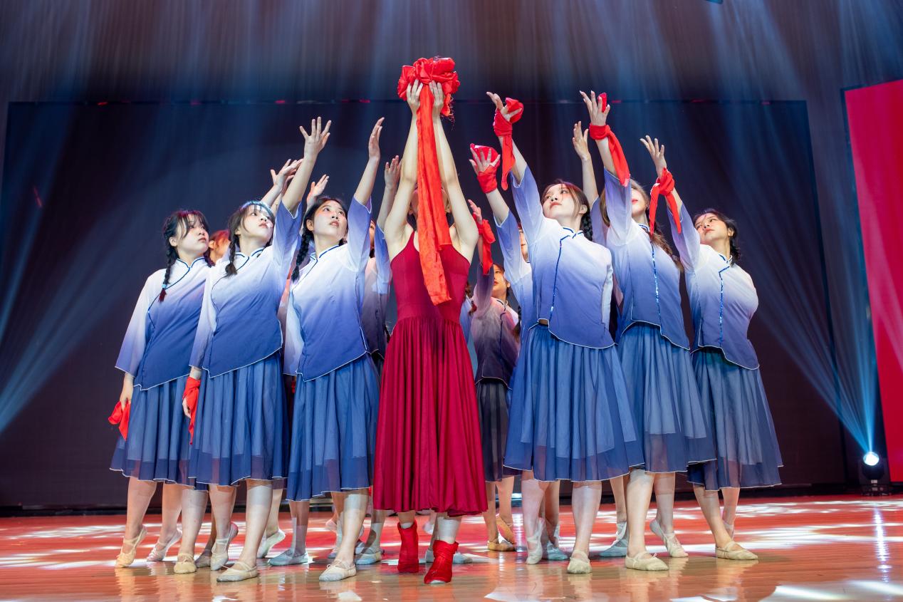 在文艺演出篇章中,学院师生以高昂的热情将乐曲、舞蹈、表演等艺术表现形式相结合,演绎了器乐合奏《红歌颂党》、歌曲《新征程》、舞蹈《红》、情景剧《铃兰花开》等精彩节目。用美好的歌声唱出了师生心底颂党百年伟绩的声音,用美妙的舞姿跳出了师生心中庆党百年华诞的喜悦,用激昂的颂词表达了师生接续谱写新时代华章的壮志。