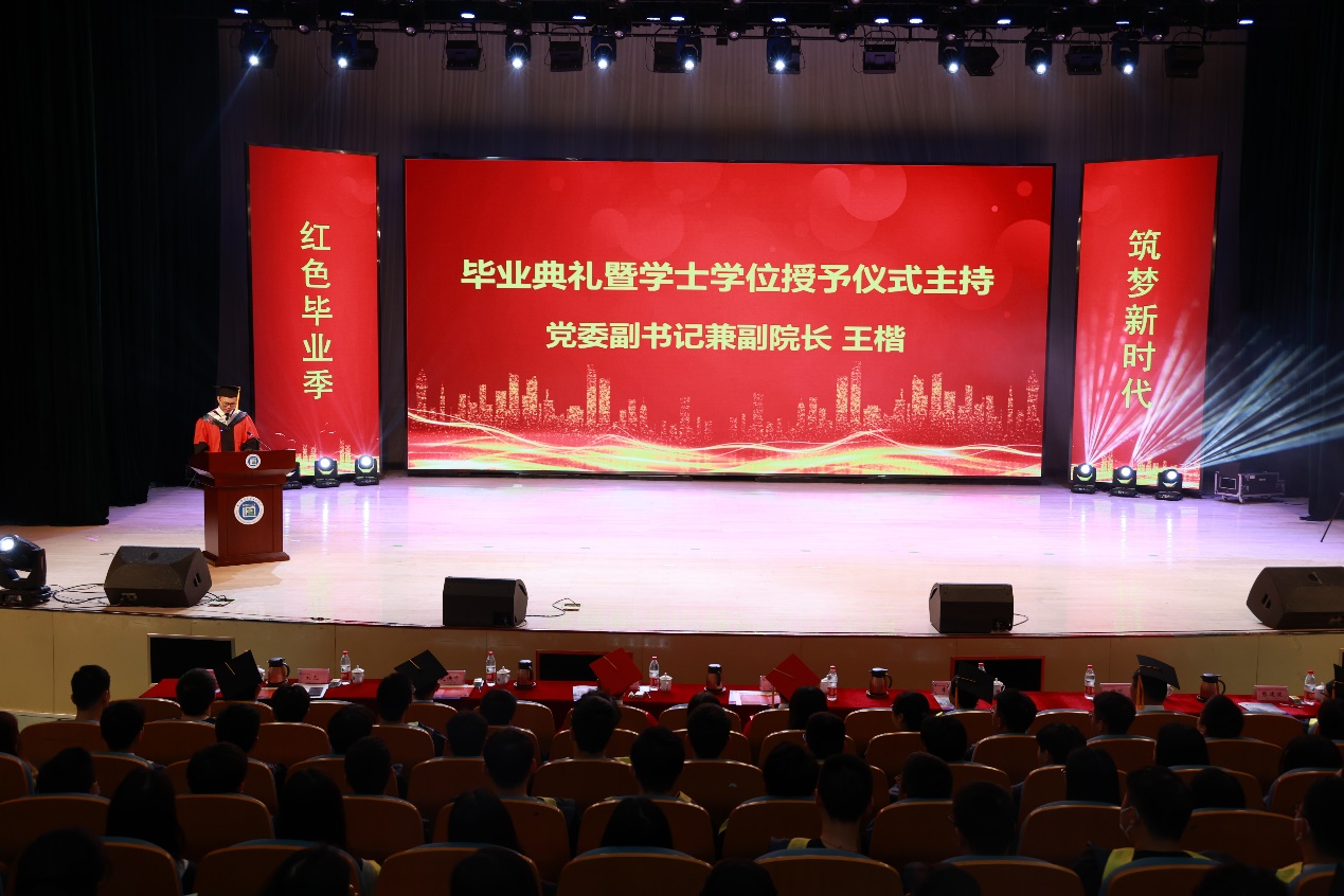 六月芳华,通达骊歌,又是一年毕业季。6月22日上午,“红色毕业季 筑梦新时代”——2021届本科生毕业典礼暨学位授予仪式在太阳官网大学生活动中心礼堂隆重举行。古天乐代言太阳集团城网址党委常委、副校长荆晅教授,全体院领导出席典礼。各职能部门和二级学院负责人、2021届毕业生、家长代表、教师代表和宿舍管理员代表等参加了典礼。毕业典礼由党委副书记兼副院长王楷主持。