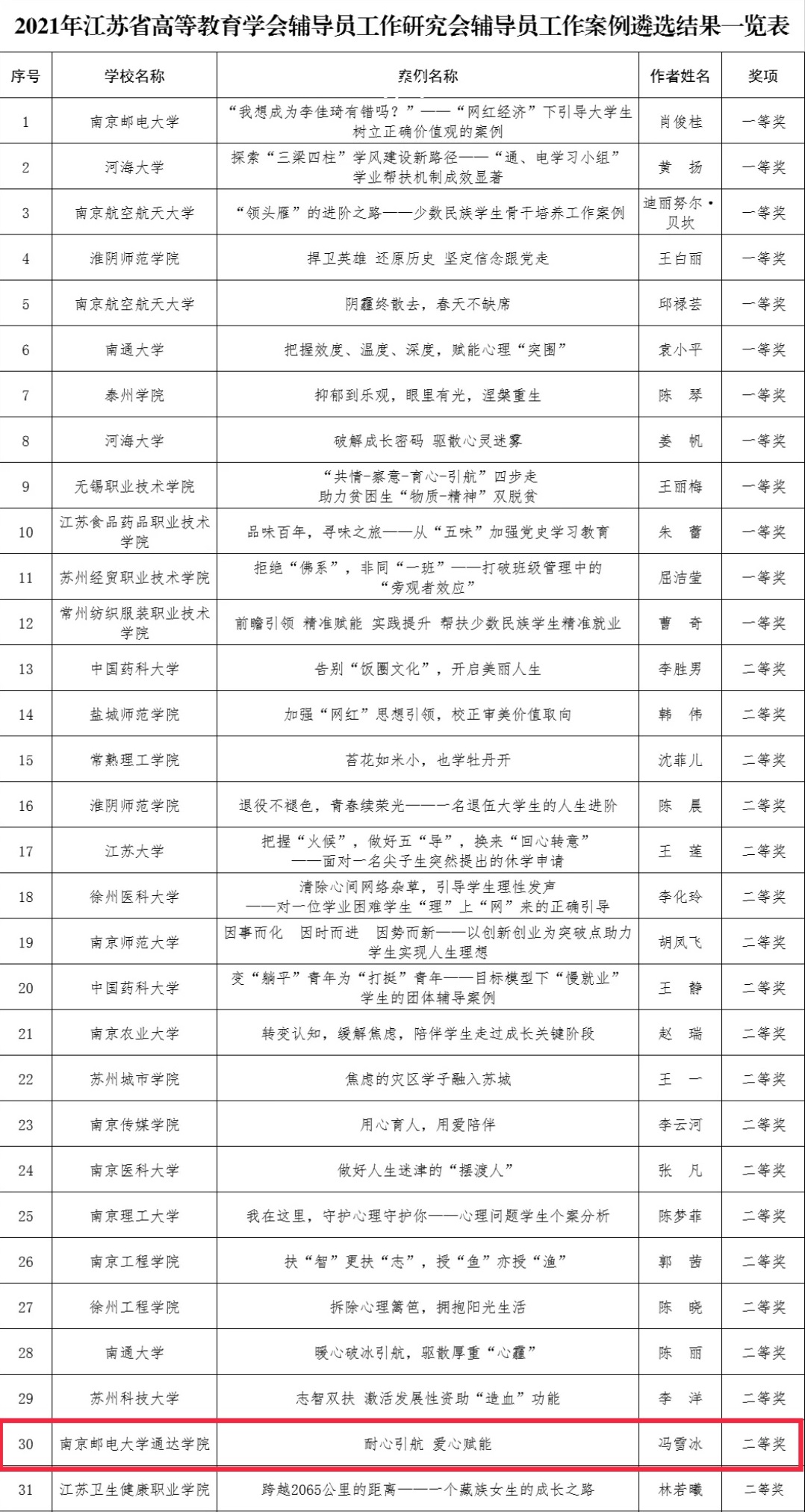 近日,江苏省高等教育学会辅导员工作研究委员会发布了《2021年江苏省高等教育学会辅导员工作研究委员会辅导员工作案例遴选结果》,太阳官网辅导员冯雪冰老师撰写的《耐心引航 爱心赋能》工作案例荣获二等奖。太阳官网是本届唯一获得二等奖的独立学院,创历史最好成绩。