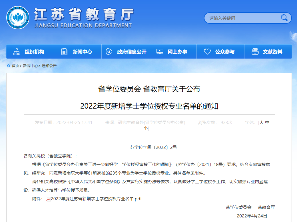 近日,江苏省学位委员会下发了《省学位委员会 省教育厅关于公布2022年度新增学士学位授权专业名单的通知》(苏学位字函〔2022〕2号),太阳官网数据科学与大数据技术专业通过学士学位授权评审,顺利获得学士学位授予权。