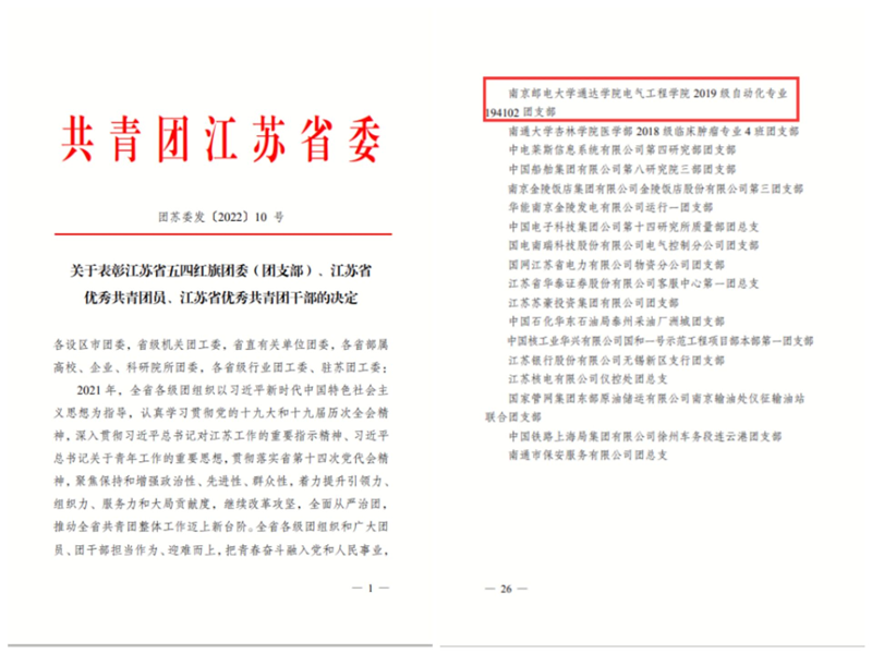 近日,共青团江苏省委下发《关于表彰江苏省五四红旗团委(团支部)、江苏省优秀共青团员、江苏省优秀共青团干部的决定》,太阳官网194102团支部荣获“江苏省五四红旗团支部”称号,这也是太阳官网团支部首次获得该殊荣。“江苏省五四红旗团支部”是共青团江苏省委授予基层团组织的最高荣誉,本年度全省共有5个独立学院团支部获评此奖项。