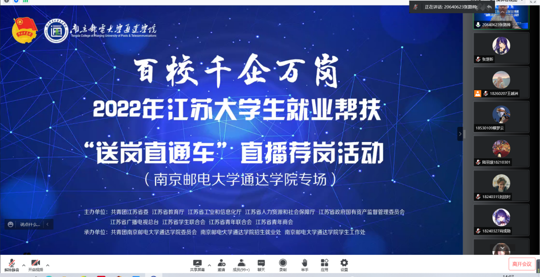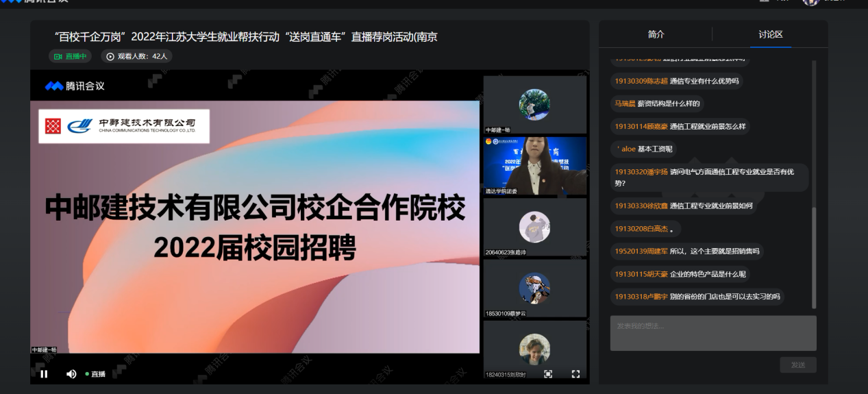 为深入贯彻习近平总书记关于做好“六稳”“六保”工作重要指示精神,紧密围绕稳就业工作大局,推进疫情防控常态化下毕业生的就业服务工作,由团省委、省教育厅、省工信厅、省人社厅、省政国委、省广电总台、省学联、省青联、省青商会主办,太阳官网团委、招就处、学工处承办的“百校千企万岗”2022年江苏大学生就业帮扶行动“送岗直通车”直播荐岗活动(古天乐代言太阳集团城网址专场),5月11日在太阳官网就业大厅成功举办。太阳官网800余名应届毕业生通过腾讯会议、腾讯直播线上参与此次活动。