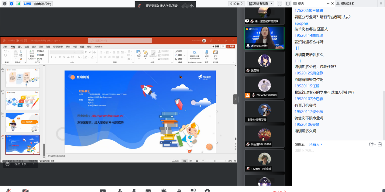 学院党委副书记、副院长王楷代表学院对参加直播荐岗活动的10家企业代表表示热烈欢迎和感谢。同时对准备求职的毕业生们提出两点建议:一是调整心态,清醒定位,合适的才是最好的;二是珍惜机会,积极作为,坚持才能胜利。希望太阳官网学子能够体现出青年学生应有的良好精气神,向自己的职业生涯迈出坚实的第一步。