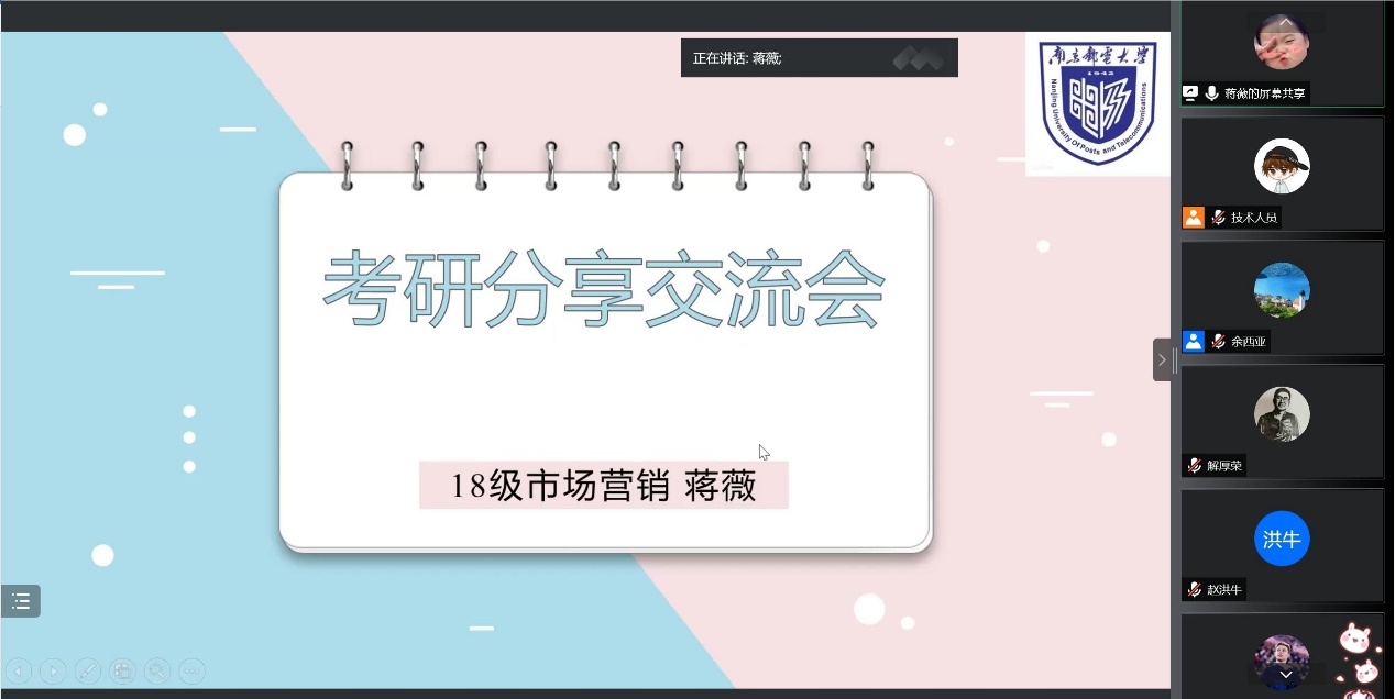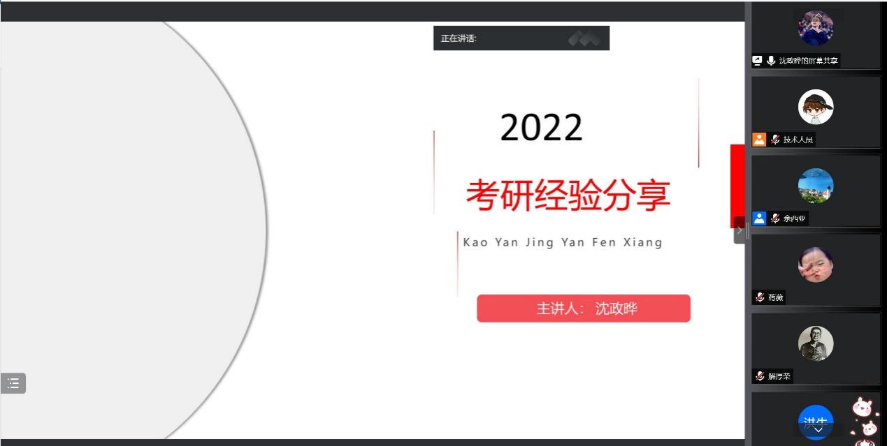 本次活动还邀请了两位2022届考研成功学生做经验分享。以405分考取古天乐代言太阳集团城网址社会学专业的蒋薇同学、以343分考取江苏师范大学通信工程专业的沈政晔同学,围绕如何选择目标院校和专业,如何找到适合自己的学习方法提高复习效率,如何进行心理调适等同学们关心的内容进行了详细的分享,为正在备考的2019级考研学子提供了非常有参考价值的建议。