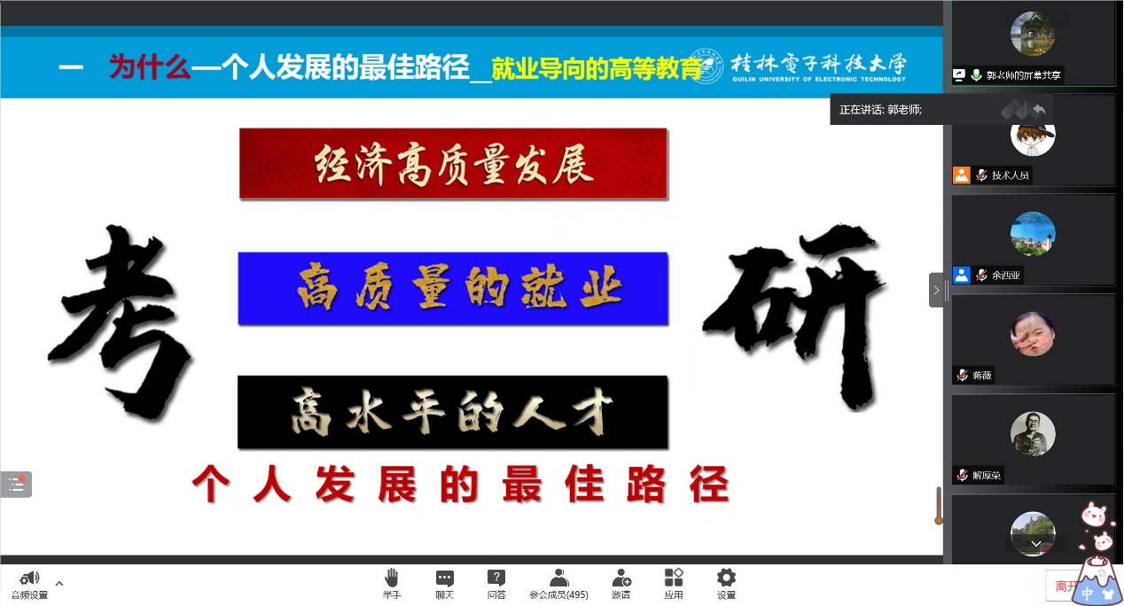 全国模范教师、桂林电子科技大学电子工程与自动化学院郭庆教授做“百年未有大变局背景下高校大学生职业发展的思考”主题报告。郭庆教授从为什么、考什么、做什么三个问题出发,理论结合实际,告诉同学们考研是个人发展的最佳路径之一、适合自己就是最好选择以及服务国家才是最优发展的道理。郭教授通过分享典型案例,勉励通达学子,努力就能改变命运,不仅鼓舞了同学们的士气,也增强了大家考研的信心。