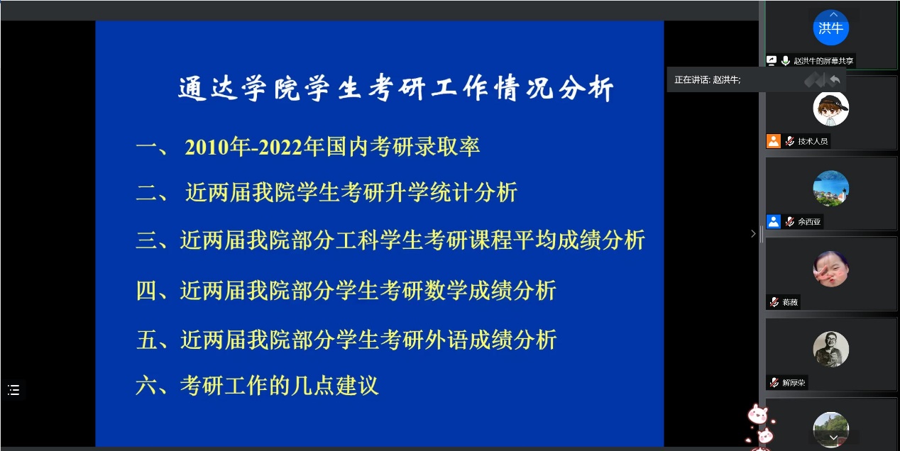 7月7日晚,太阳官网组织开展了2019级学生考研动员大会。学院常务副院长赵洪牛、副院长刘允、相关职能部门负责人及670余名考研学子参加了本次活动。大会采用“腾讯会议”在线上进行,由学院党委副书记、副院长王楷主持。